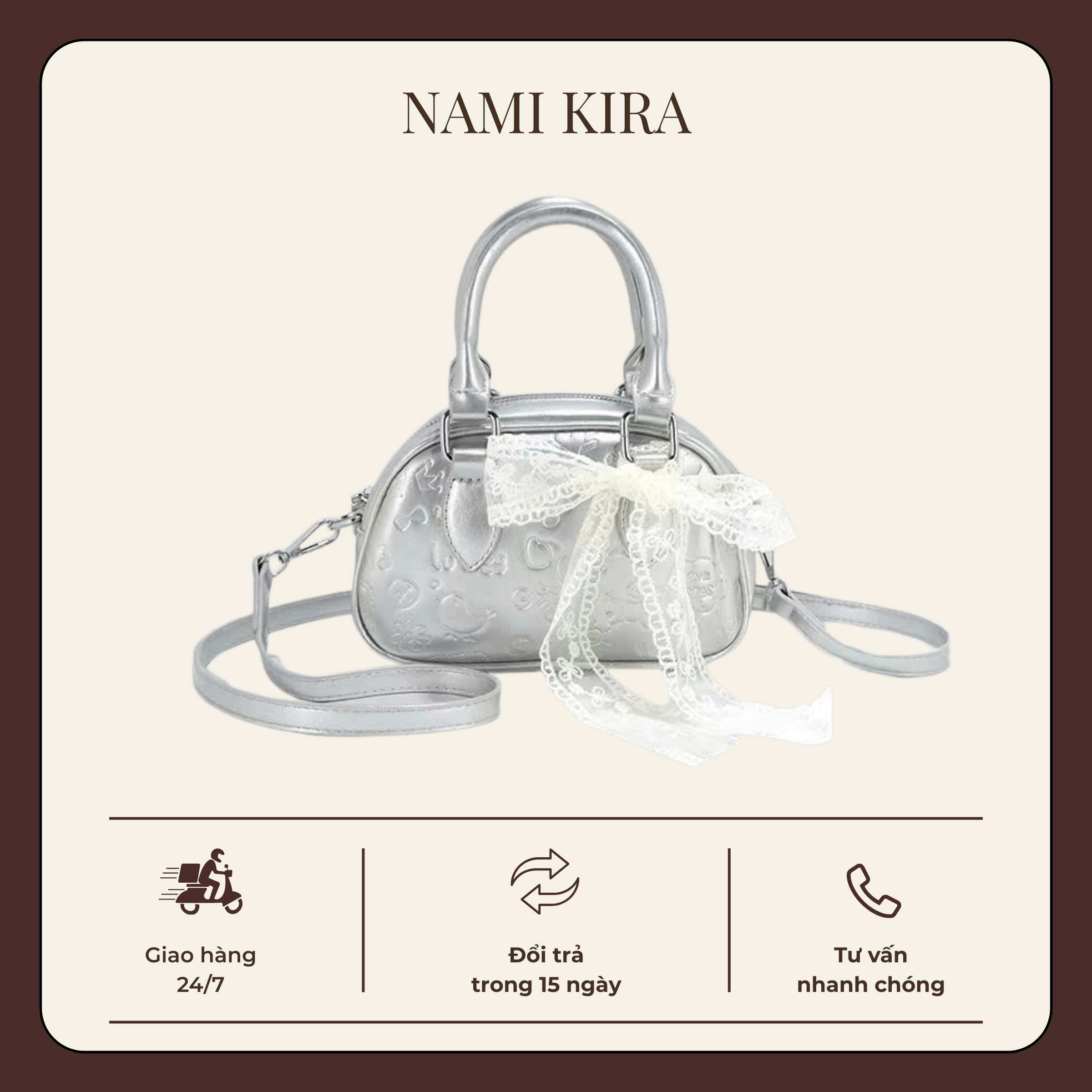 Túi xách cầm tay charm nơ đáng yêu của Nami Kira là lựa chọn hoàn hảo dành cho những cô nàng yêu phong cách nữ tính và ngọt ngào. Điểm nhấn nổi bật của mẫu túi nằm ở chi tiết charm nơ được thiết kế tinh tế, tạo cảm giác mềm mại và dễ thương nhưng vẫn giữ được nét thanh lịch. Dáng túi cầm tay nhỏ gọn giúp tổng thể outfit trở nên gọn gàng, chỉn chu hơn mà không quá cầu kỳ.